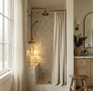 Use natural textiles. Swap plastic shower liners for linen curtains. Linen diffuses natural window light beautifully and softens the visual noise of the room.