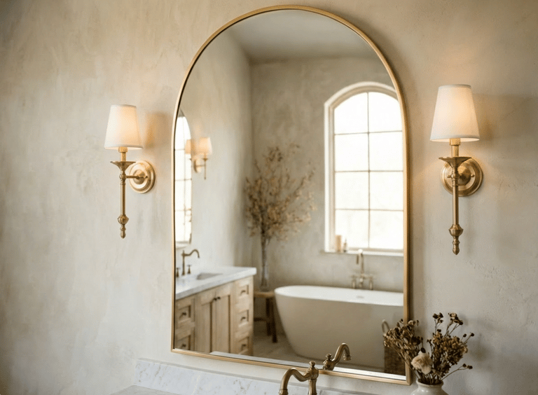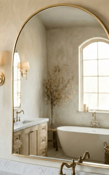 When designing a warm minimalist bathroom, you have to balance straight lines with soft curves. That’s why I chose this specific arched mirror from Amazon.